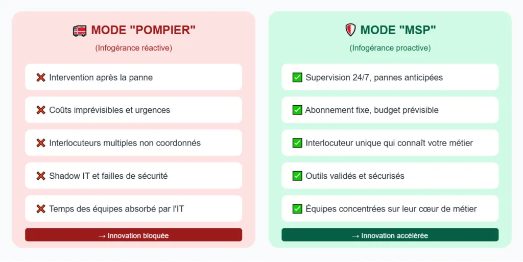 Le MSP, ou prestataire de services managés, répond précisément à ce défi. Contrairement au dépannage ponctuel, l’infogérance proposée par un MSP repose sur une prise en charge globale et proactive :