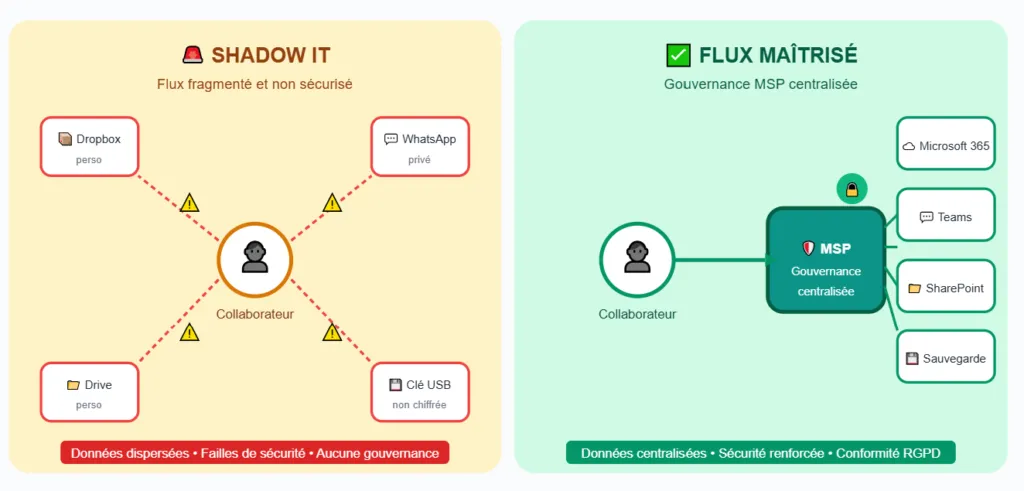 Quand l’IT interne ne suit pas le rythme, les collaborateurs trouvent leurs propres solutions : outils de partage non sécurisés, applications personnelles pour le travail, stockage sur des services grand public. Ce “Shadow IT” crée des failles de sécurité majeures et fragmente les données de l’entreprise. Un MSP structure ces usages pour permettre l’agilité sans sacrifier la sécurité ni la souveraineté numérique.
